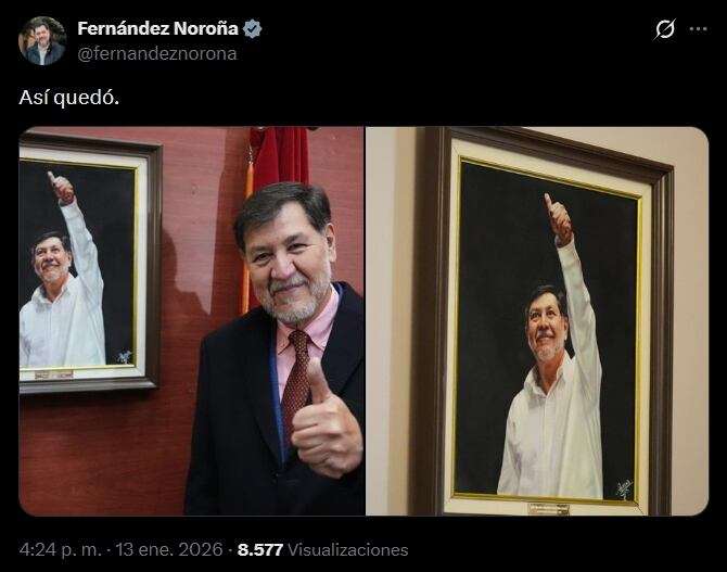 El senador Gerardo Fernández Noroña develó este martes 13 de enero su retrato oficial en la galería de presidentes de la Mesa Directiva del Senado, el cual muestra al político de camisa blanca, sonriente y con el pulgar arriba.
