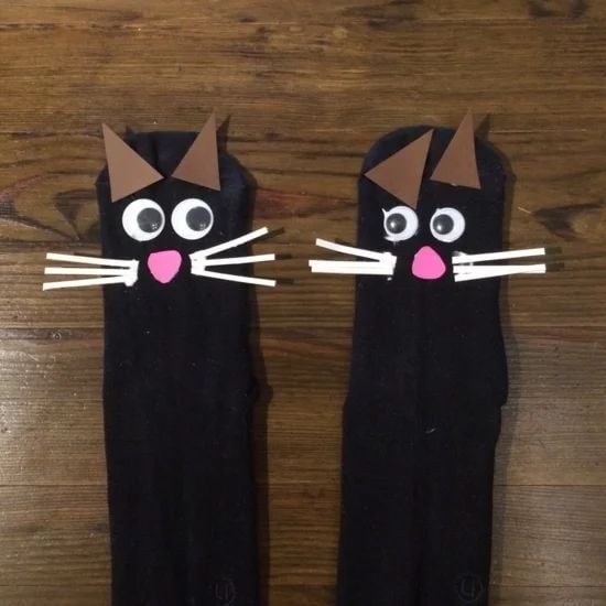 Calcetas locas de monstruos: La cantidad de monstruos será tu elección. Ya sean dos grandes hechos con felpas de peluche colorido o muchos pequeños con bolitas de algodón de colores. Aparte de esto necesitarás ojos saltones para ponerles según tu imaginación.