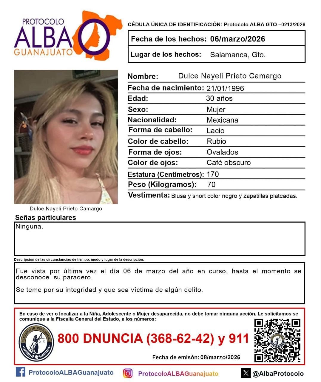 De acuerdo a la cedula única de identificación Protocolo Alba GTO- 0213/2026, Dulce vestía blusa y short en color negro y zapatillas plateadas, tiene una estatura de 170 centímetros y un peso de 70 kilogramos, pelo rubio lacio y ojos café oscuro cualquier información que pueda aportar a su localización proporcionándola a través del 911 o 800 DNUNCIA (368-62-42).