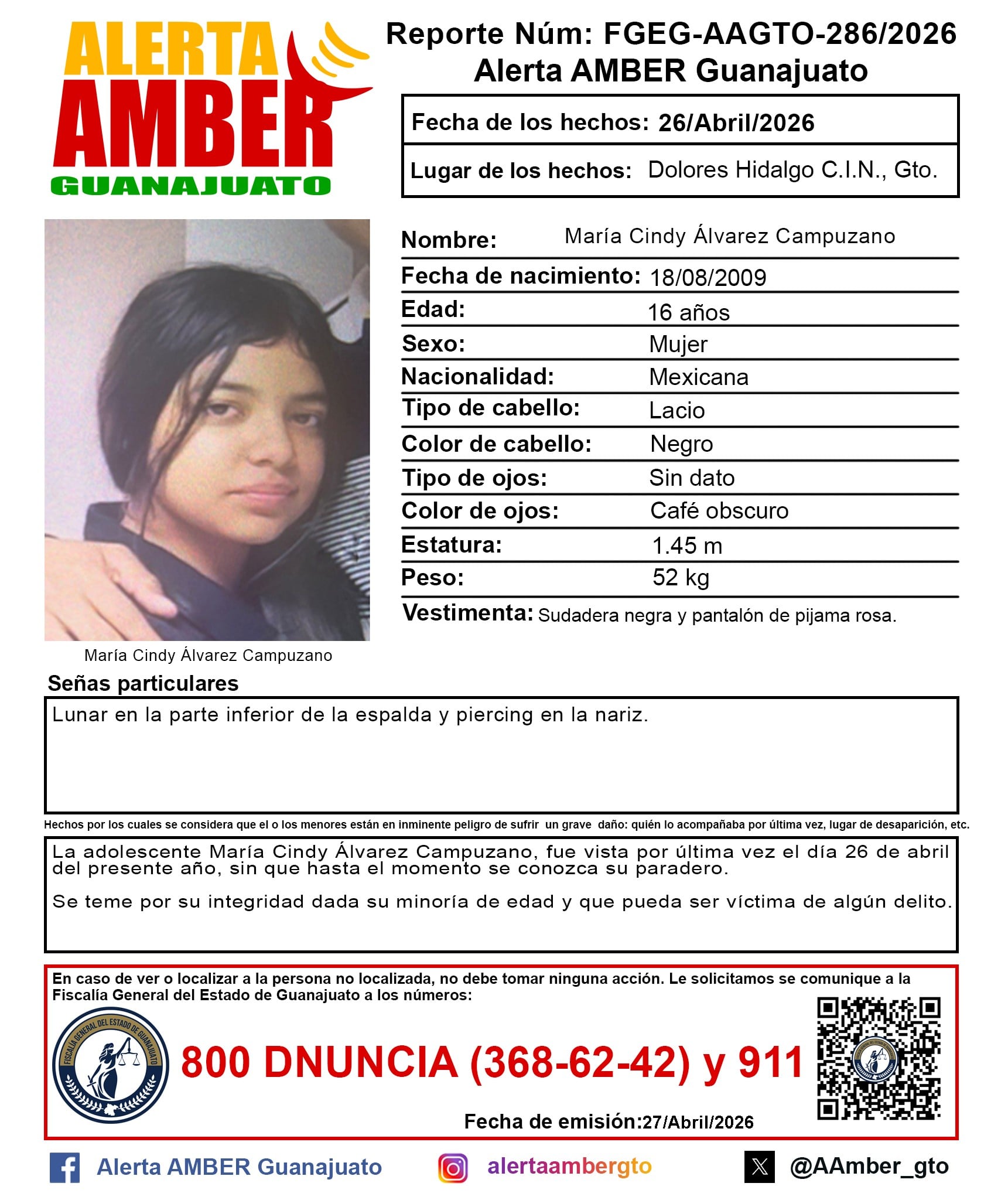 María Cindy Álvarez Campuzano tiene 16 años y desapareció el 26 de abril en Dolores Hidalgo. Ese día llevaba sudadera negra y pantalón de pijama rosa.