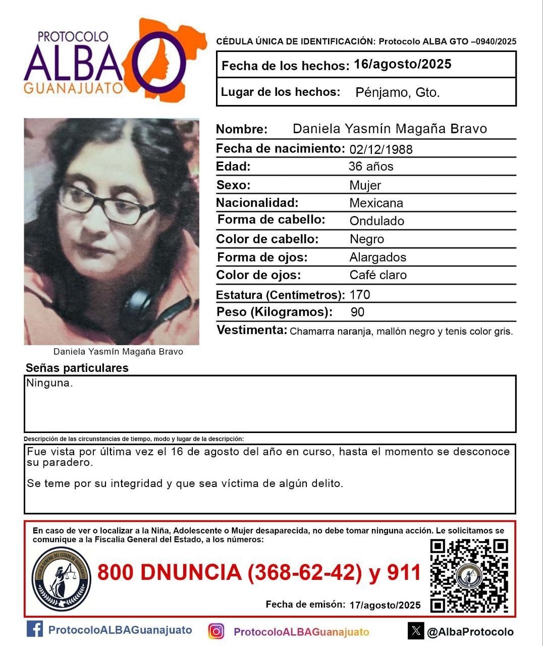 Pénjamo, Gto.- La Fiscalía General del Estado de Guanajuato activó el Protocolo Alba para la búsqueda de Daniela Yasmín Magaña Bravo, mujer de 36 años que fue vista por última vez el pasado 16 de agosto de 2025 en el municipio de Pénjamo.