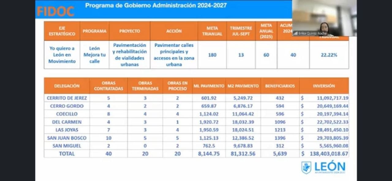 León, Gto.- Durante el Programa de Gobierno de la Administración 2024-2027, de la meta de 180 obras programadas, durante el primer año, solo se han ejecutado 40, lo que corresponde al 22.22%.