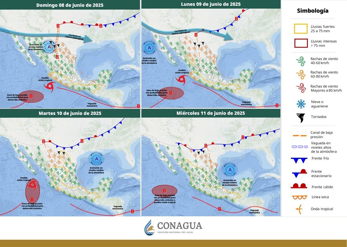Su presencia en el territorio nacional junto con una zona baja de presión, la corriente en chorro subtropical y la inestabilidad atmosférica generarán lluvias, chubascos, vientos fuertes y tolvaneras junto a la permanencia de ola de calor en varios estados del país.