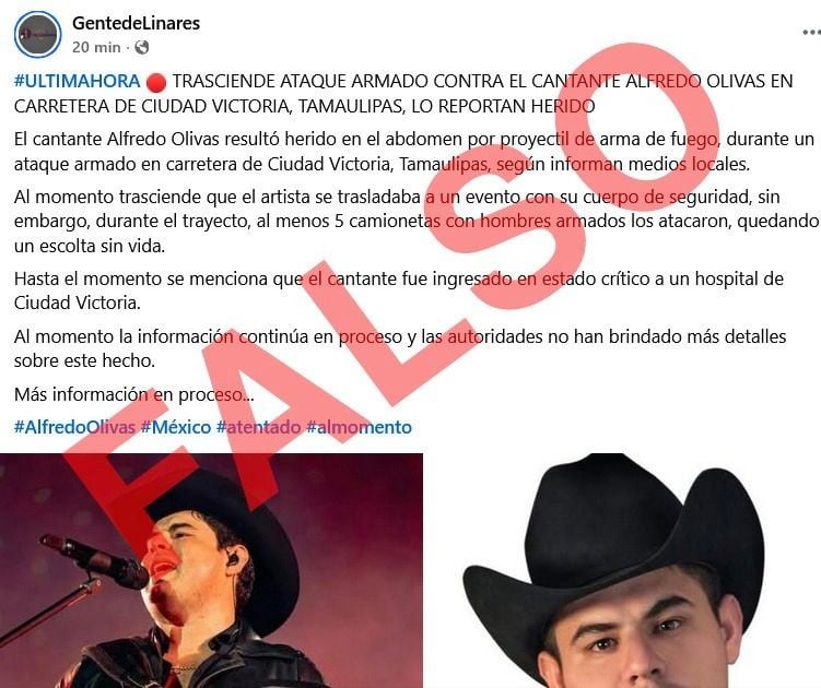Ciudad de México, México.- El cantante Alfredo Olivas confirmó que se encuentra a salvo después de presuntos rumores que señalaban había sido atacado en Tamaulipas.