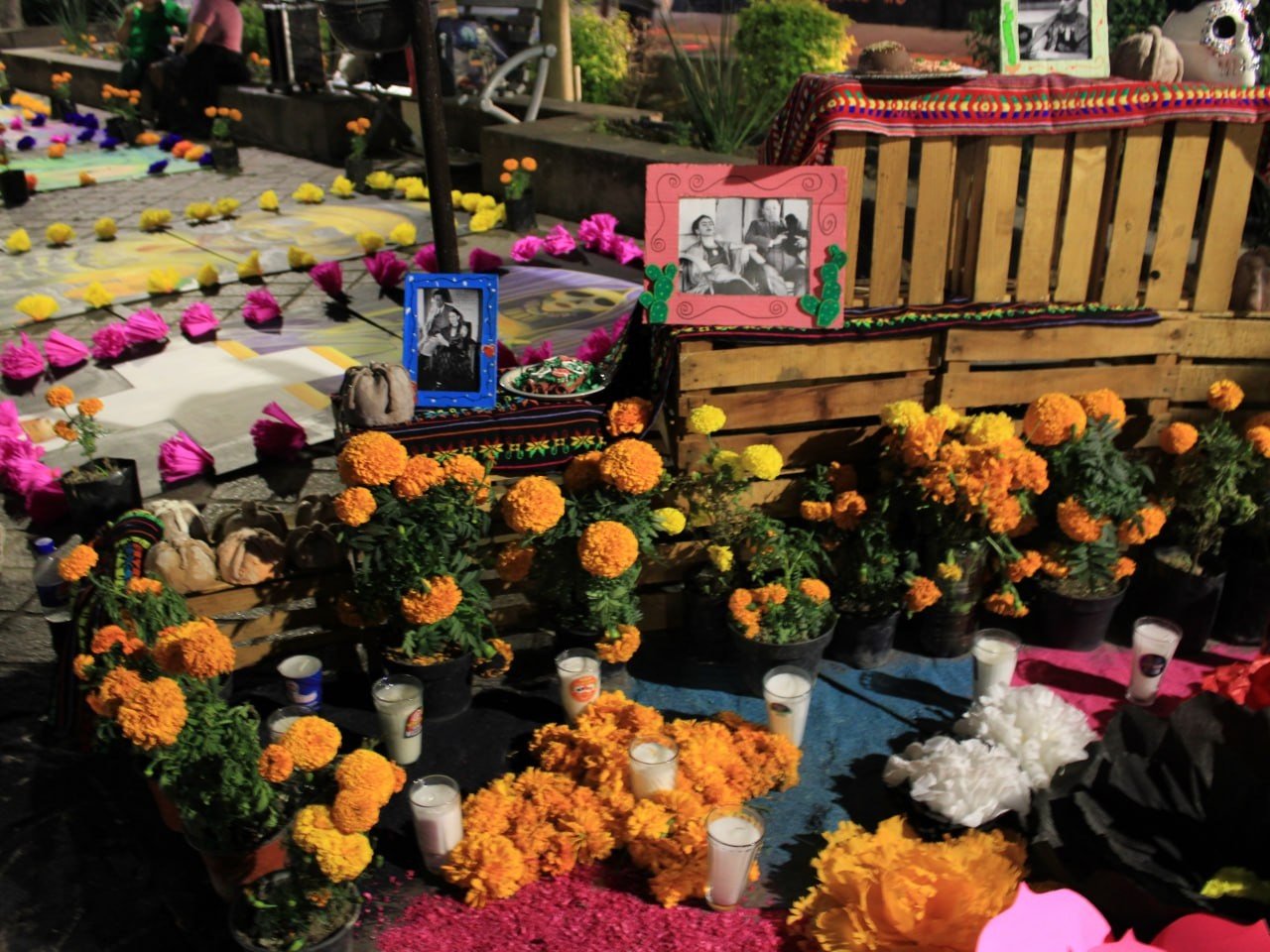 En las ofrendas se pudieron observar tapetes de semillas, veladoras, pan de muerto, arcos con flores de cempasúchil, y mucho papel picado.