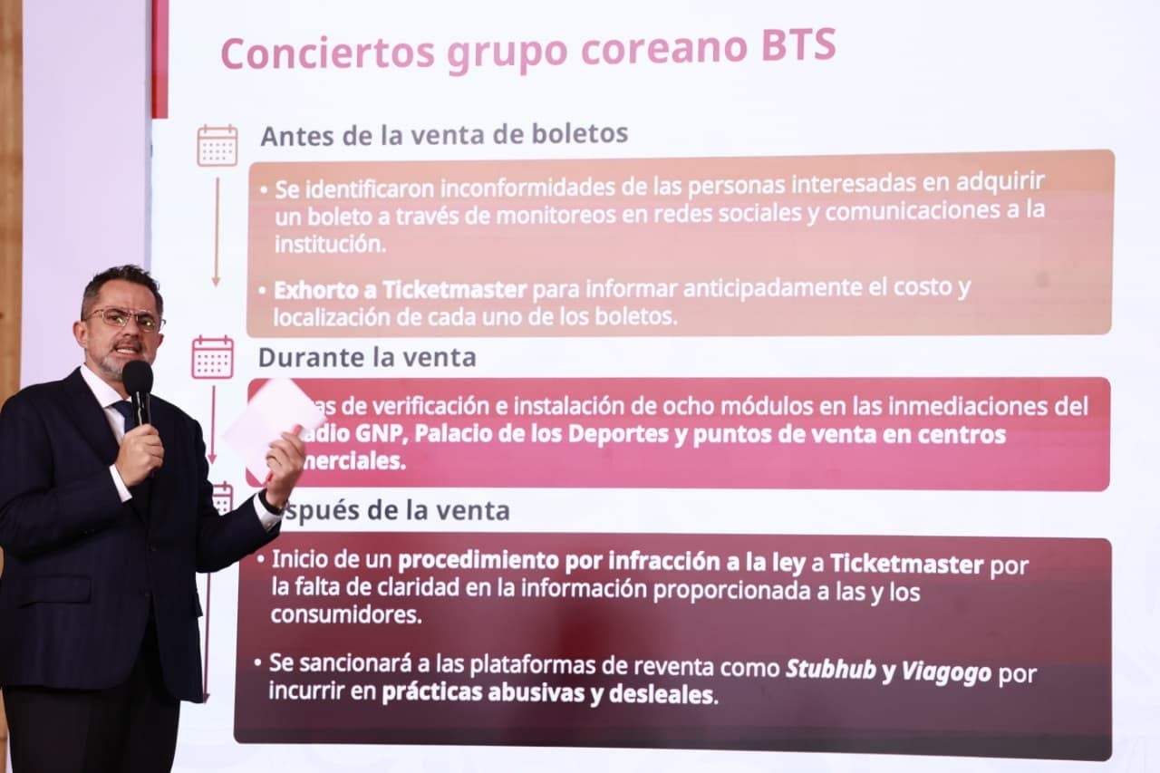 En la conferencia Mañanera de Sheinbaum del 26 de enero, Iván Escalante, titular de Profeco, detalló que las inconformidades comenzaron antes del inicio formal de la venta de boletos de BTS, banda que tiene programados tres shows en el Estadio GNP de la Ciudad de México (7, 9 y 10 de mayo de 2026).