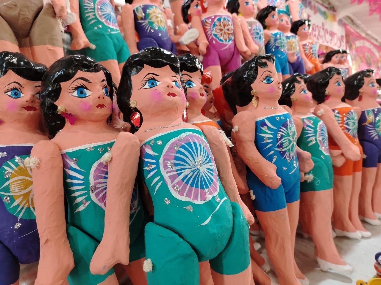 Todo un espectáculo visual ofrece el puesto de Lidia, muñecas de cartón con colores intensos, decorados con diamantina, cuyo precio va desde los 60 hasta los 200 pesos según el tamaño, máscaras de demonios, toritos de madera, carros y camiones desde los 25 hasta los 180 pesos, réplicas de camas, salas y comedores de madres de hasta 120 pesos. También se ofrecen juegos de mesa de madera como el dominó y Jenga cuyo precio es desde los 30 pesos.