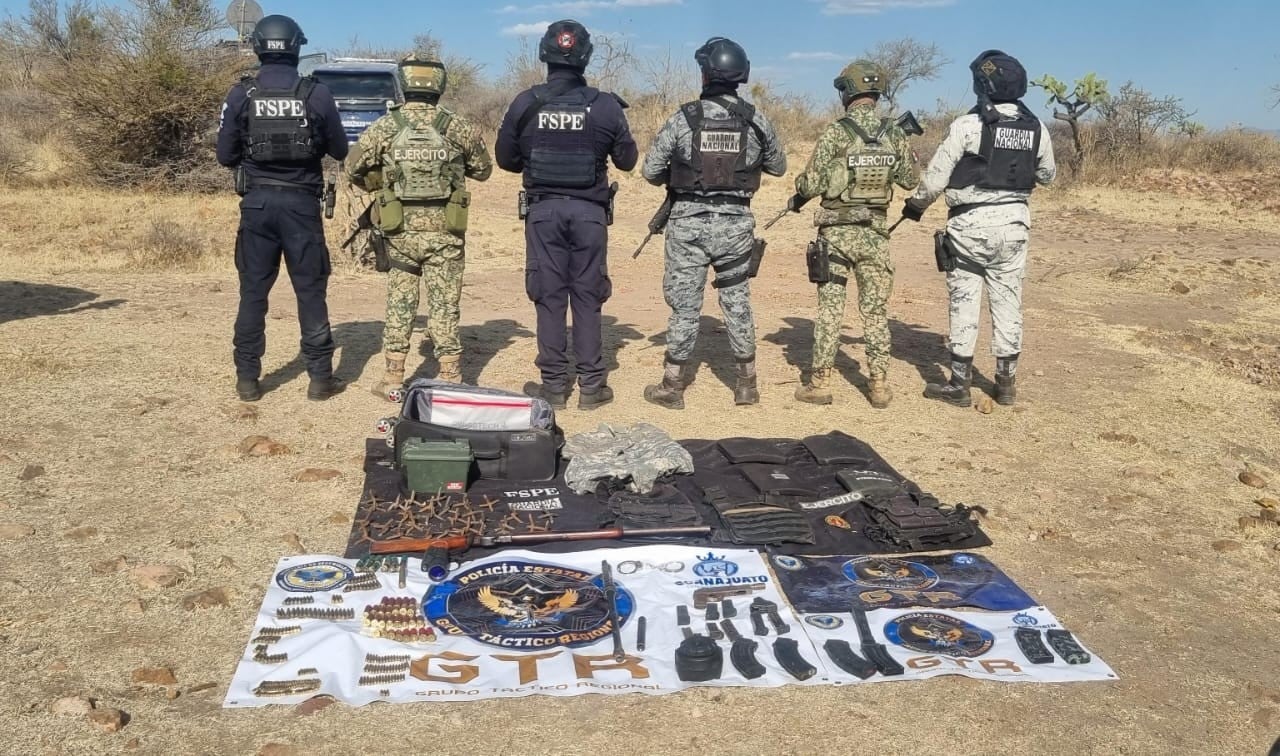 Juventino Rosas, Guanajuato.- La Secretaría de Seguridad y Paz, a través del Grupo Táctico Regional de las Fuerzas de Seguridad Pública del Estado (FSPE) y en coordinación con el Ejército Mexicano y la Guardia Nacional, aseguró armamento, municiones y equipo táctico durante un operativo.