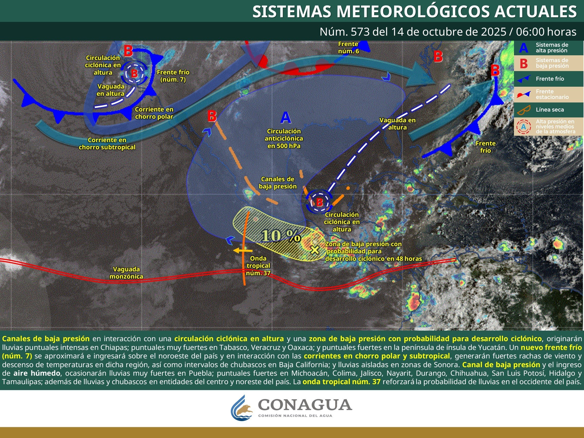 También se esperan lluvias fuertes en Chiapas, Veracruz, Oaxaca, Puebla y Guerrero, donde podrían presentarse inundaciones y deslaves en zonas vulnerables.