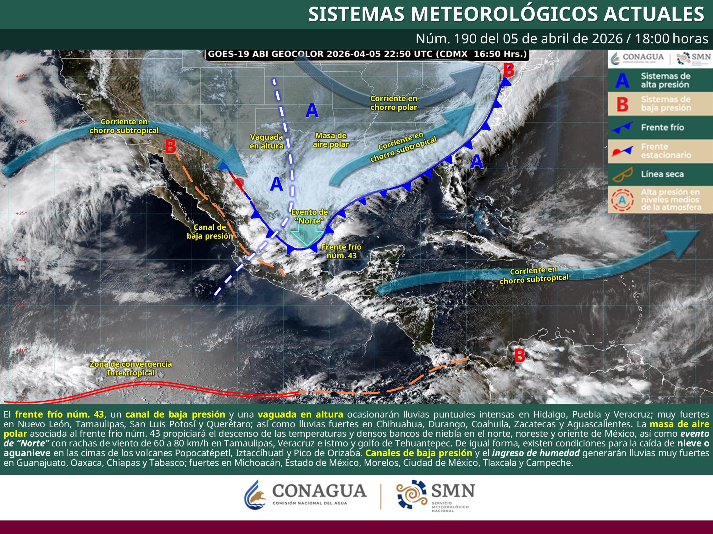 Este sistema atmosférico favorecerá condiciones lluviosas en gran parte del centro del país, incluyendo el Bajío, donde se esperan chubascos acompañados de descargas eléctricas y posible caída de granizo. Además, la masa de aire polar asociada al frente contribuirá a mantener mañanas frescas y condiciones variables durante el día.