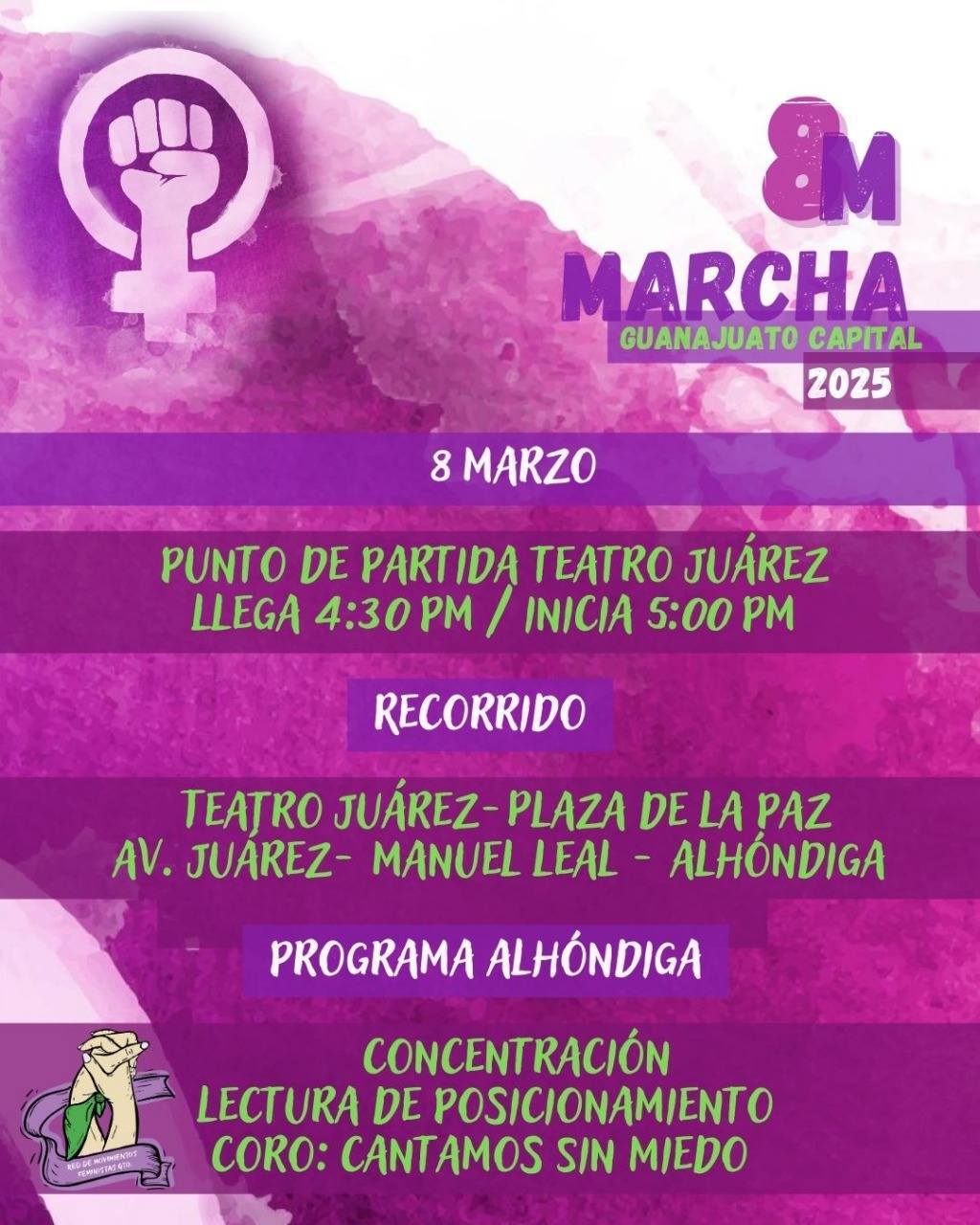 Con fin de exigir justicia y el fin de la violencia de género se ha convocado a que todas las mujeres de Guanajuato capital asistan a la marcha del 8M. La cita de la marcha es a las 4:30 de la tarde en el Teatro Juárez y el recorrido empezará a las 5:00 p.m.