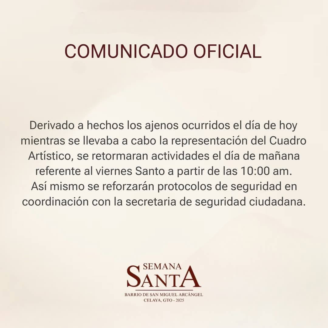 A la medianoche, los organizadores del Viacrucis anunciaron en redes sociales que las actividades del templo continuarían este Viernes Santo a partir de las 10:00 de la mañana, con la representación del tradicional Viacrucis. También informaron que contarán con el resguardo de elementos de la Secretaría de Seguridad Ciudadana para proteger a los actores que participen en las Tres Caídas, así como a los asistentes.