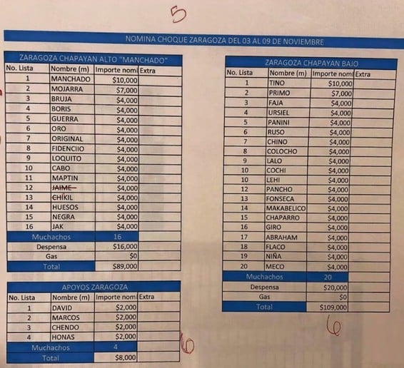 En los documentos destaca una nómina de 20 mil pesos titulada “Escuela Viejo Chapa”, con pagos de entre 2 mil, 3 mil y 5 mil pesos a ocho sujetos, de los cuales dos son identificados con el alias Comandant.
