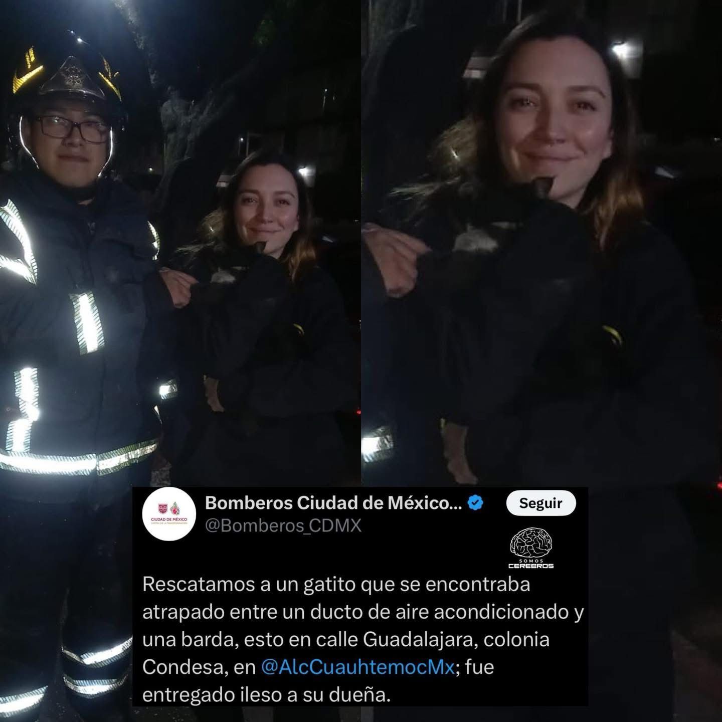 En el tuit se leía: “Rescatamos a un gatito que se encontraba atrapado entre un ducto de aire acondicionado y una barda, esto en calle Guadalajara, colonia Condesa, en @AlcCuauhtemocMx; fue entregado ileso a su dueña. Servicio concluido”