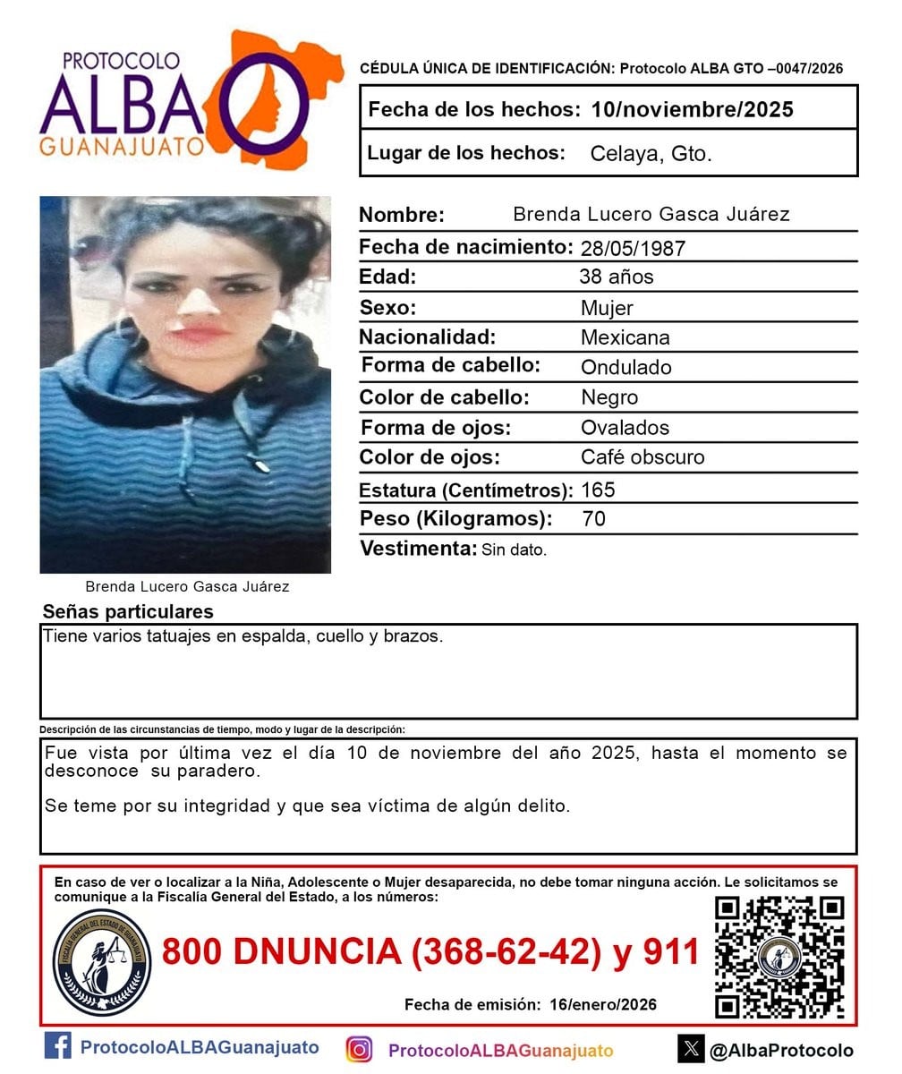 La mujer de 38 años, Brenda Lucero Gasca Juárez, fue vista por última vez el 10 de noviembre de 2025 en Celaya.