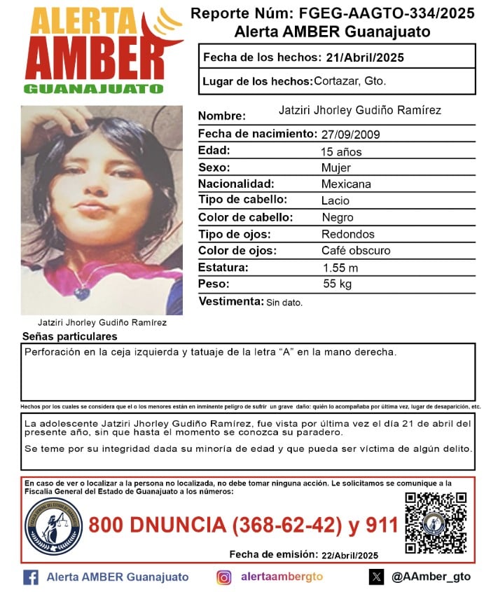 Jatziry Jhorley Gudiño Ramírez de 15 años fue vista por última vez el día 21 de abril. Para identificar su familia da la siguiente descripción: cabello lacio negro, ojos redondos café oscuro, mide 1.55 m y pesa 55 kg.