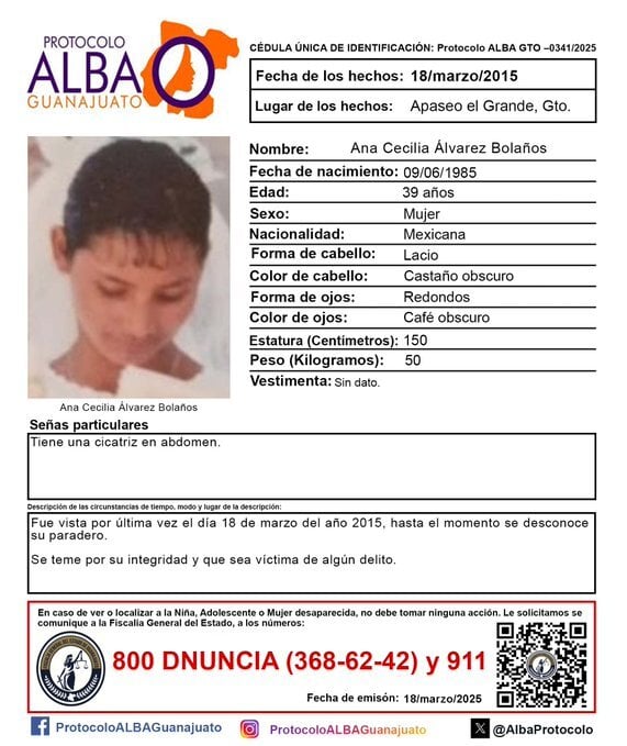 La chica Ana Cecilia Álvarez Bolaños de 39 años fue vista saliendo de su domicilio en Apaseo el Grande, Gto el día 18 de marzo. Para identificarlo la familia da la siguiente descripción: cabello lacio castaño oscuro, ojos redondos color café oscuro, mide 1.50 m y pesa 50 kg. Tiene una cicatriz en el abdomen.