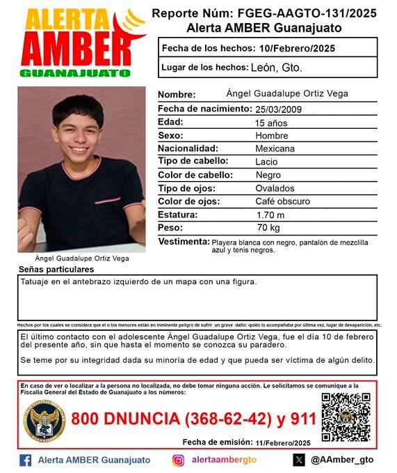El chico Ángel Guadalupe Ortiz Vega de 15 años fue visto saliendo de su domicilio en León, Gto el día 10 de febrero. Para identificarlo la familia da la siguiente descripción: cabello lacio negro, ojos ovalados color café oscuro, mide 1.70m y pesa 70 kg. Vestía una playera blanca con negro, pantalón de mezclilla azul y tenis negros. Tiene un tatuaje en el antebrazo izquierdo de un mapa con una figura.