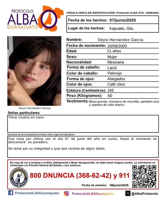 Deysi Hernández García de 21 años fue vista saliendo de su domicilio en Irapuato, Gto el día 7 de junio. Para identificar la familia da la siguiente descripción: cabello lacio pelirrojo, ojos alargados color café claro, mide 1.65 m y pesa 60 kg. Vestía una blusa guinda, chamarra de mezclialla, pantalón azul y zapatos de color blancos. Tiene una cicatriz en la nariz.