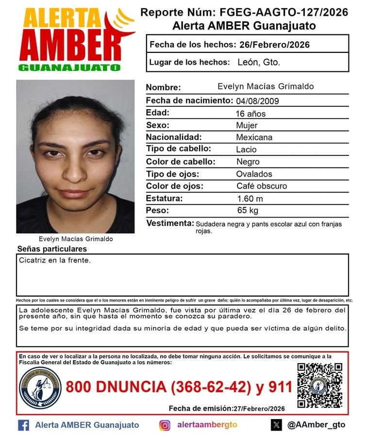 La adolescente Evelyn Macías Grimaldo de 16 años desapareció el 26 de febrero en la ciudad de León.