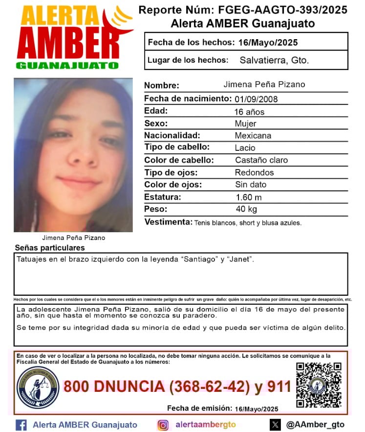 Si tiene información que ayude a localizarlas, por favor comuníquese inmediatamente al número de emergencias 911 o Fiscalía General del Estado de Guanajuato al 800 (362-62-42).