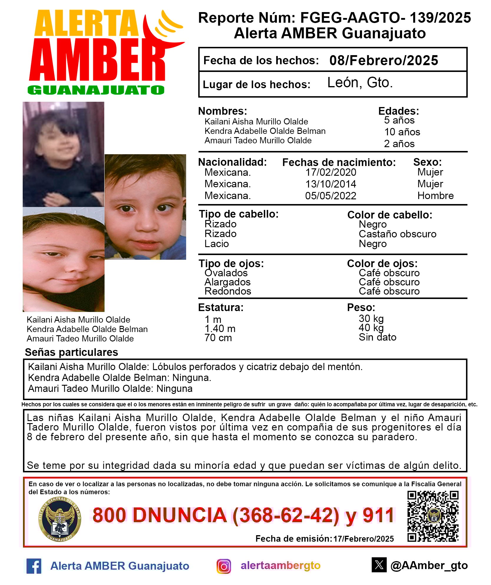 Keilani Aisha Murillo Olalde de 5 años de edad, tiene el cabello rizado negro y los ojos ovalados café oscuro. Mide 1 metro y pesa 30 kilos. Como señas particulares tiene lóbulos perforados y cicatriz debajo del mentón.