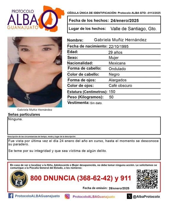 Activan Protocolo Alba por Gabriela Muñiz Hernández de 29 años, fue vista por última vez el 24 de enero en Valle de Santiago, Gto. Sus rasgos característicos son: cabello negro ondulado, ojos café oscuro alargados, de una complexión mediana, pesa 50 kg y mide 1.50. No hay datos específicos de su vestimenta. Se teme por su integridad y que sea víctima de algún delito.