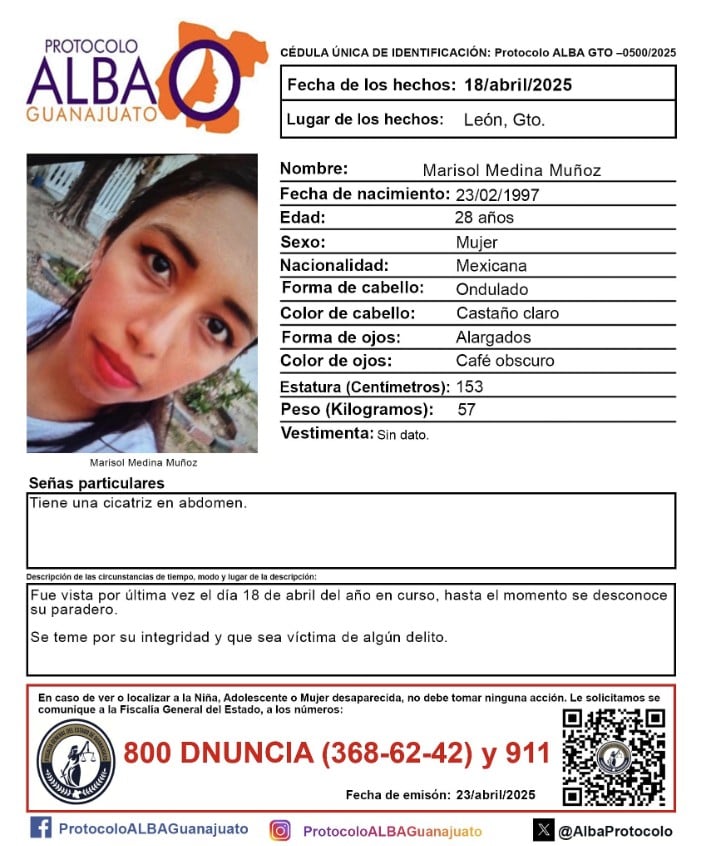 Si tiene información que ayude a localizarla, por favor comuníquese inmediatamente al número de emergencias 911 o Fiscalía General del Estado de Guanajuato al 800 (362-62-42).
