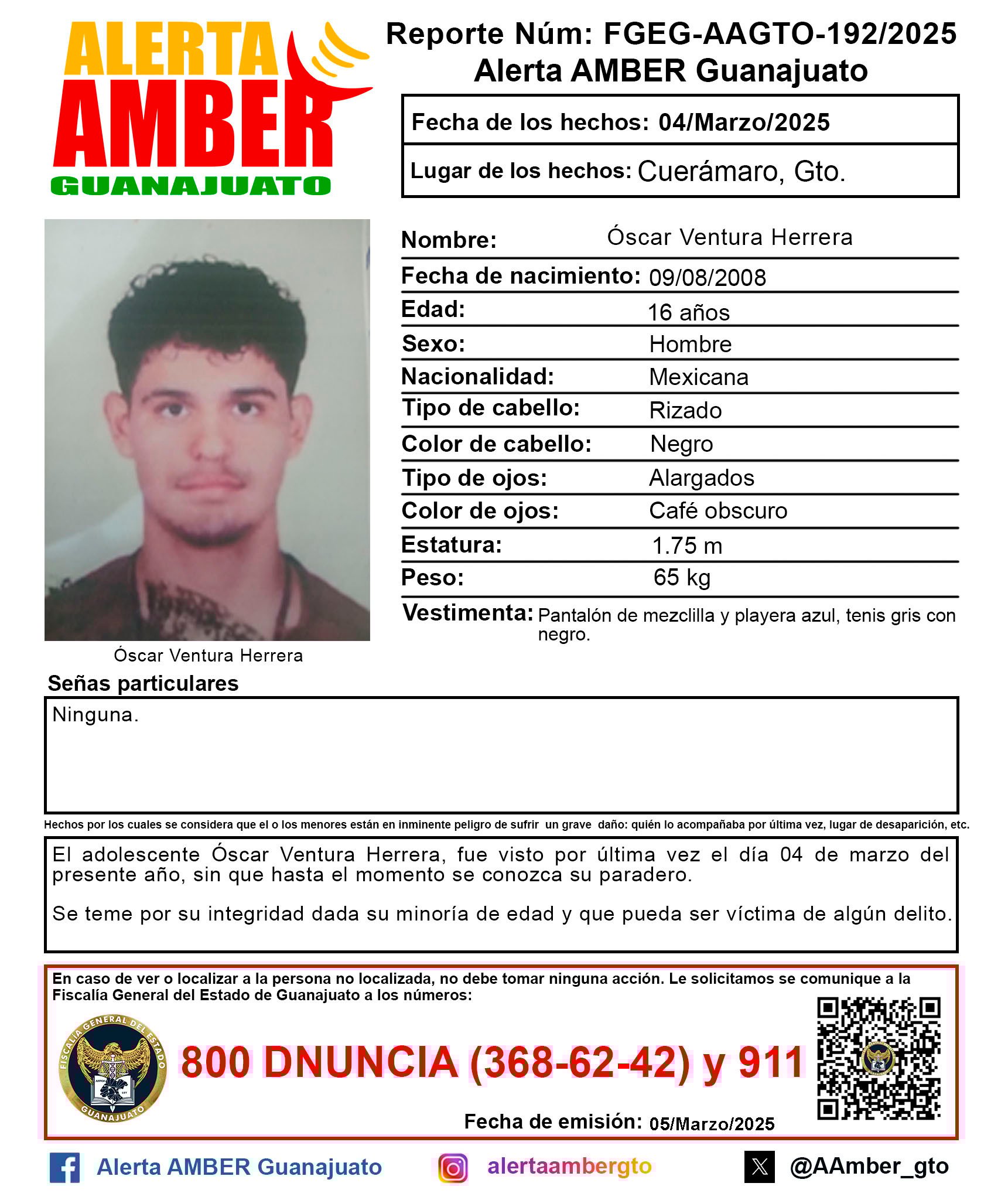 Se activó la Alerta Amber por Óscar Ventura Herrera de 16 años de edad, desaparecido en Cuerámaro. Fue visto por última vez el 4 de marzo del año en curso. Hasta el momento se desconoce su paradero, se teme por su integridad por su minoría de edad y que sea víctima de algún delito.