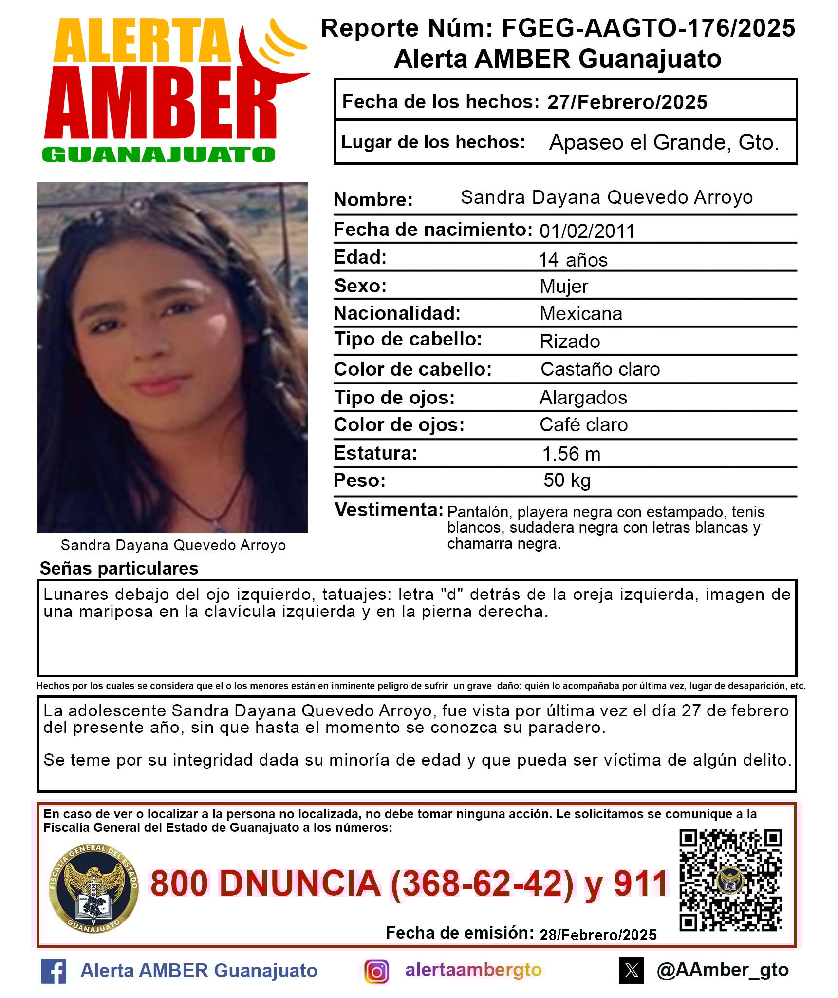 La adolescente de 14 años, Sandra Dayana Quevedo Arroyo, fue vista por última vez el pasado 27 de febrero en Apaseo el Alto cuando vestía pantalón, playera negra con estampado, tenis blancos, sudadera negra con letras blancas y chamarra negra. La joven tiene el cabello rizado castaño claro, ojos alargados color café claro y mide 1.56 m.