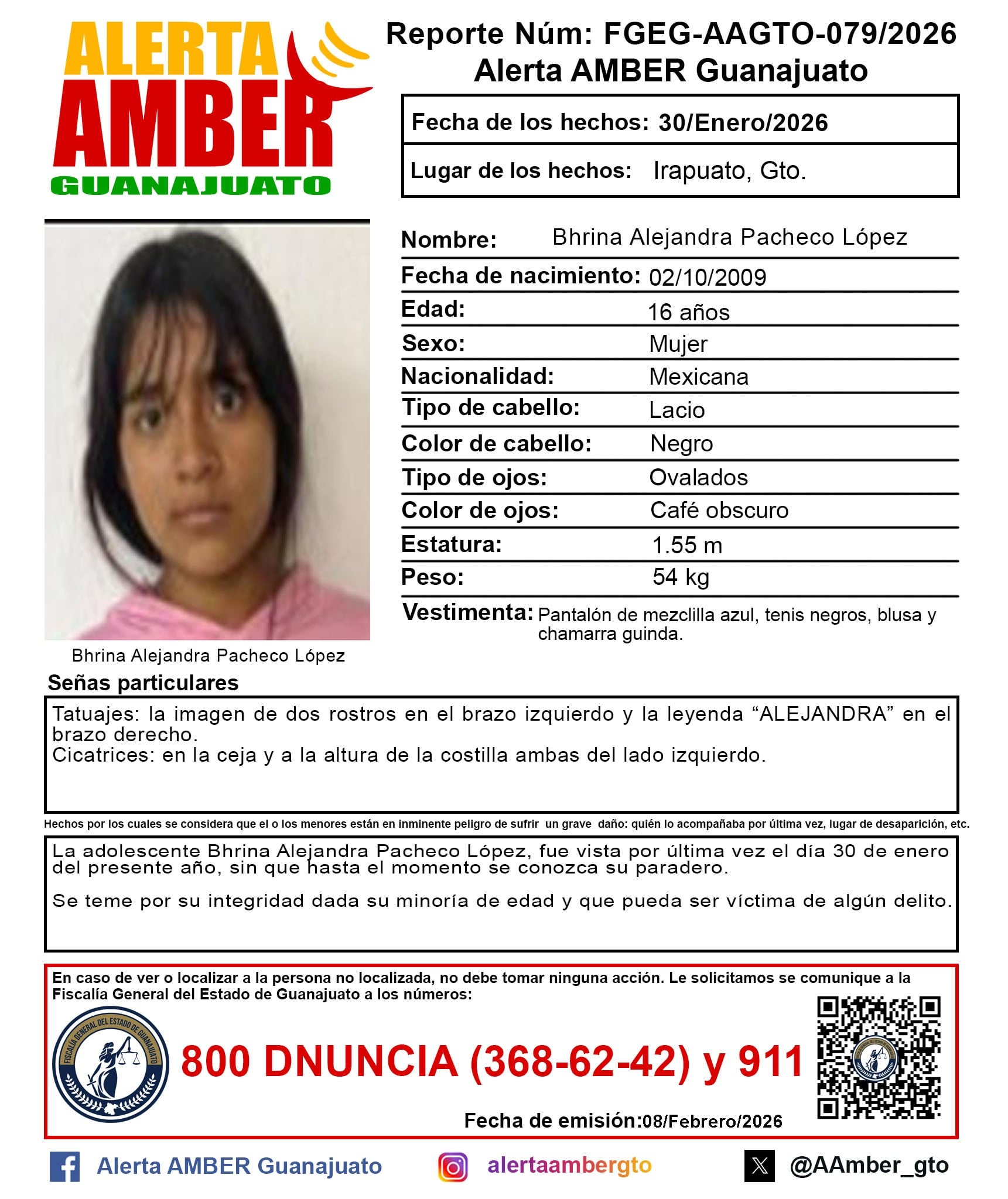 La adolescente Bhrina Alejandra de 16 años, originaria de Irapuato mide 1.55 m y pesa 54 kg; tiene cabello lacio y negro; sus ojos son ovalados, café obscuro. Desapareció el 30 de enero. Como señas particulares son: tatuajes de dos rostros en el brazo izquierdo y la leyenda “Alejandra” en el derecho. Además cicatrices en la ceja y en la costilla, ambas del lado izquierdo.