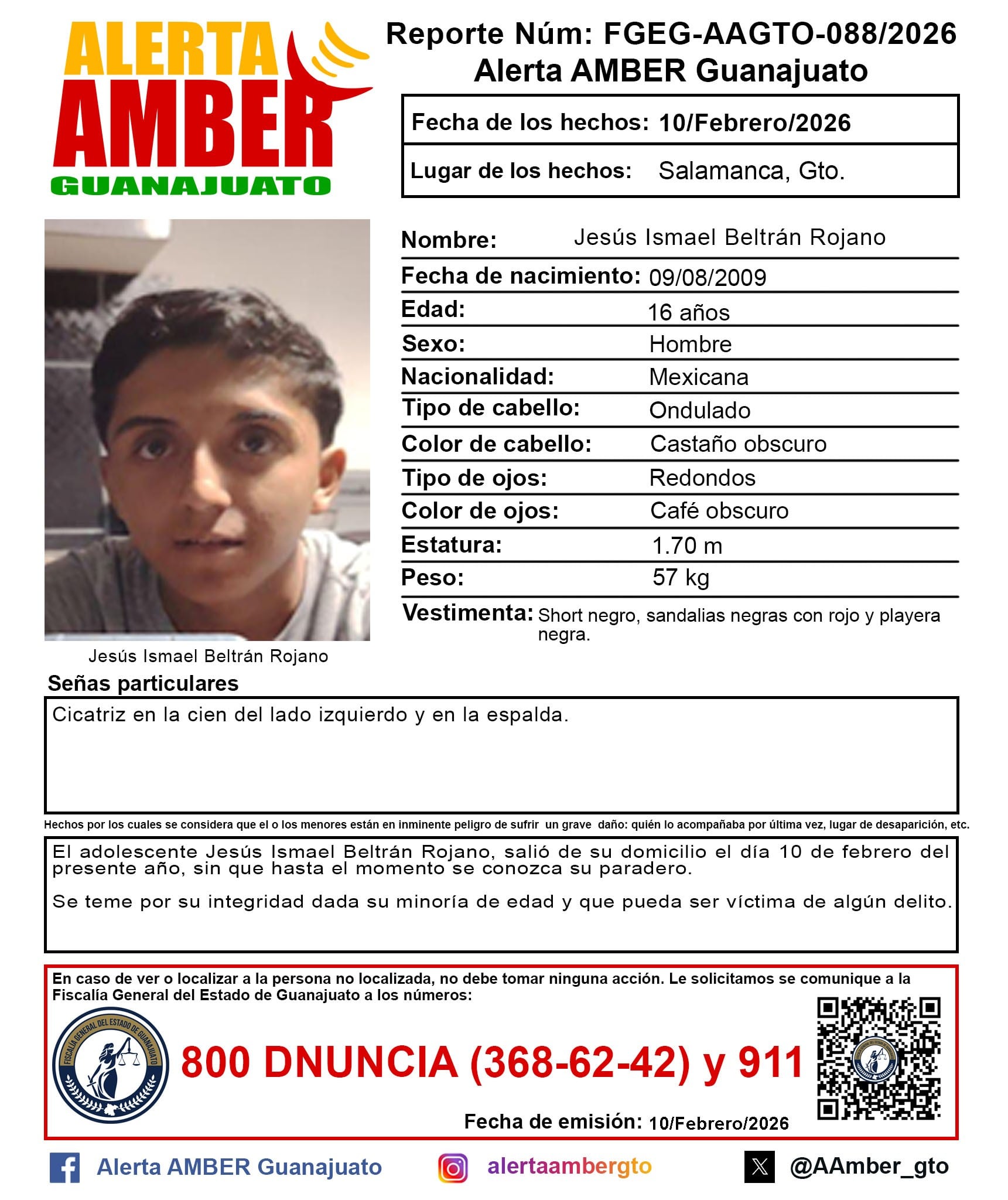 Guanajuato, Gto.- En las últimas horas, en el estado de Guanajuato se activó la Alerta Amber por la desaparición de un adolescente y el Protocolo Alba por tres mujeres no localizadas. Se trata de: