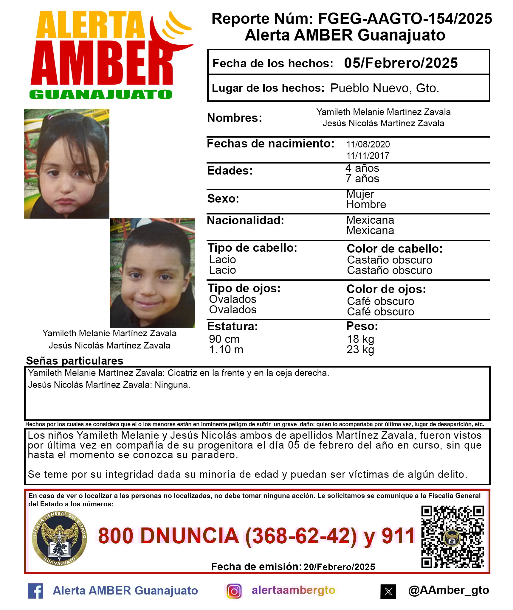 Si tiene información que ayude en la localización de los menores desaparecidos, por favor comuníquese a la brevedad con las autoridades correspondientes, al 911 el número de emergencias o con la Fiscalía General del Estado al 800 (368-62-42).