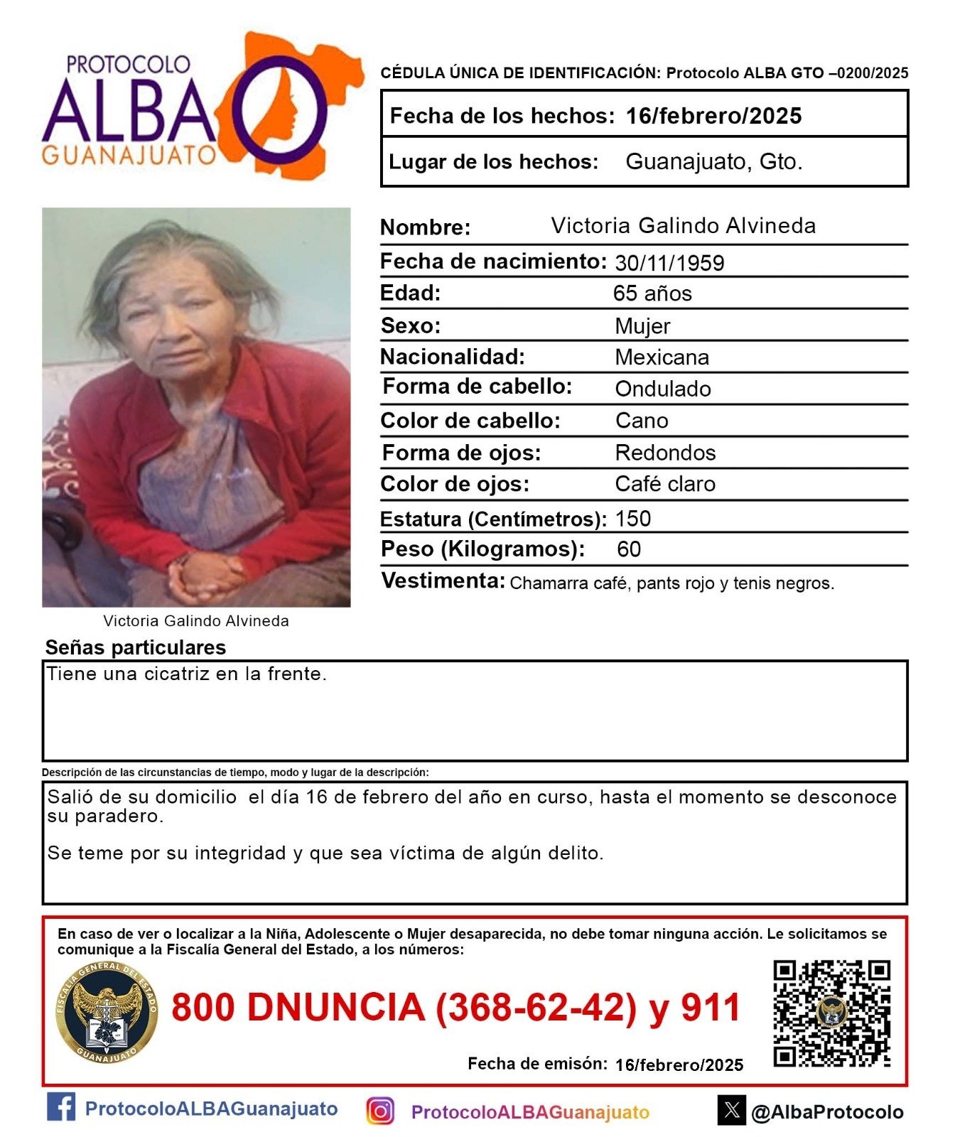 Activan el Protocolo Alba por Victoria Galindo Alvineda de 65 años de edad, desaparecida en Guanajuato. Fue vista por última vez el 16 de febrero del año en curso. Hasta el momento se desconoce su paradero, se teme por su integridad y que sea víctima de algún delito.