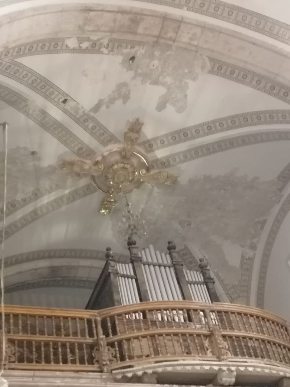 De acuerdo con trabajadores del templo, desde hace aproximadamente ocho meses la bóveda comenzó a presentar los primeros daños y actualmente muestra signos notorios de humedad, lo que ha provocado el desprendimiento del acabado y de la pintura.