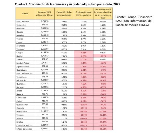 La analista señala que “el poder adquisitivo de las remesas cayó en la mayoría de los estados; sin embargo, destaca el Estado de México (-19.52 por ciento), Ciudad de México (-16.50 por ciento) y Sinaloa (-15.37 por ciento).