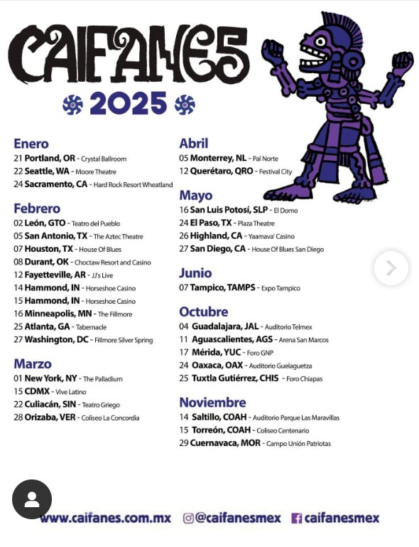 La gira de Caifanes 2025 comenzará el próximo 21 de enero en Portland y finalizará hasta noviembre en Torreón. En total, la banda mexicana realizará 32 conciertos por México y Estados Unidos durante el 2025.