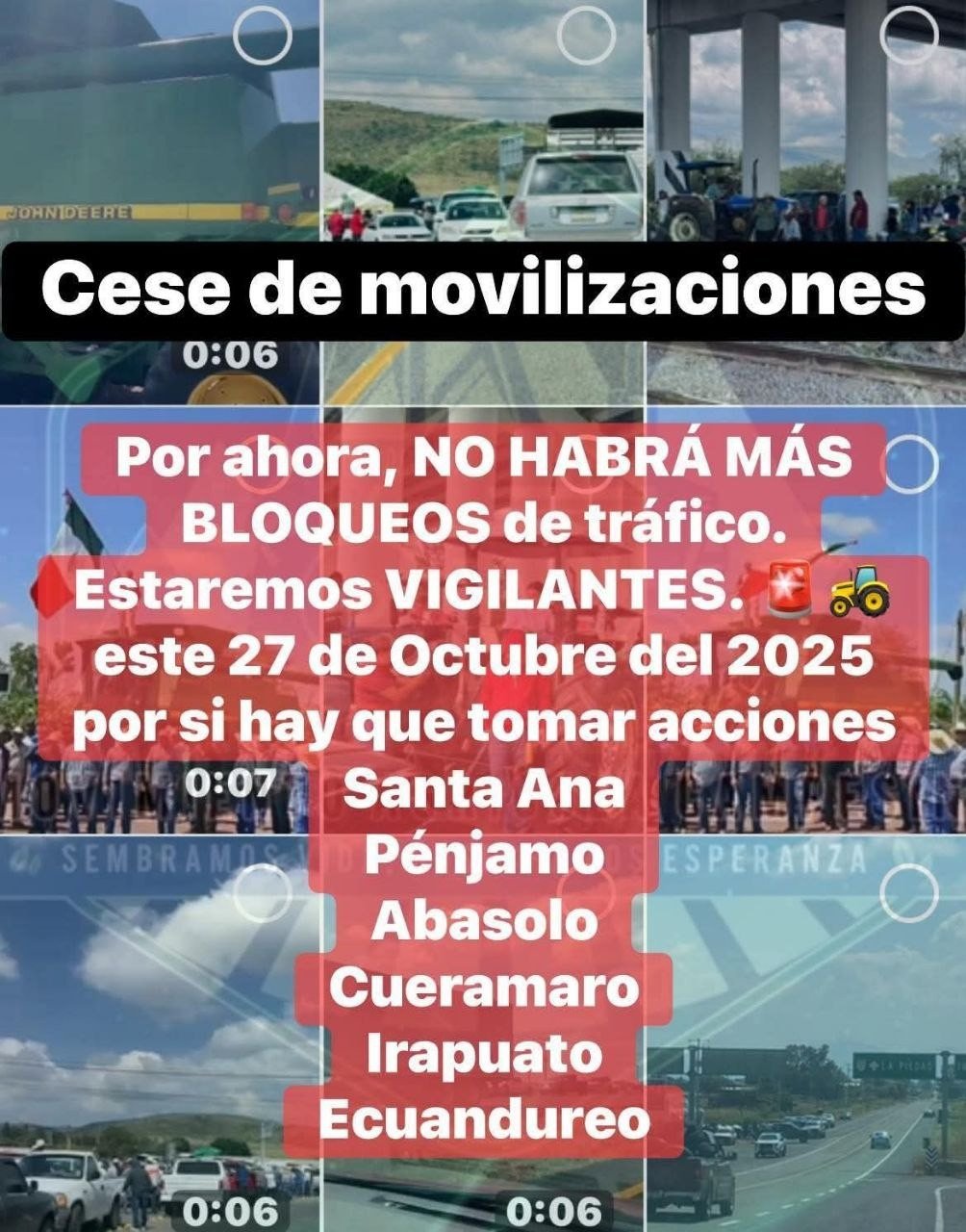 “Cese de movilizaciones. Por ahora no habrá más bloqueos de tráfico, estaremos vigilantes este 27 de octubre del 2025 por si hay que tomar acciones. Santa Ana, Pénjamo, Abasolo, Cuerámaro, Irapuato Ecuandureo”, publicaron en redes sociales productores agrícolas.