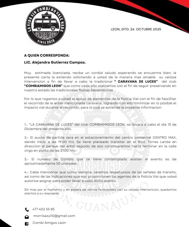 En el documento dirigido a la alcaldesa Alejandra Gutiérrez Campos, el presidente nacional del club, Edgar Humberto Villalpando López, solicitó la intervención del Municipio para facilitar el recorrido y minimizar el impacto vial durante el trayecto de cerca de 50 combis decoradas con luces navideñas. El recorrido tuvo como punto de partida el estacionamiento de Centro Max, continuó sobre el bulevar Juan José Torres Landa y finalizó en la calle Virgo alrededor de las 21:00 horas.