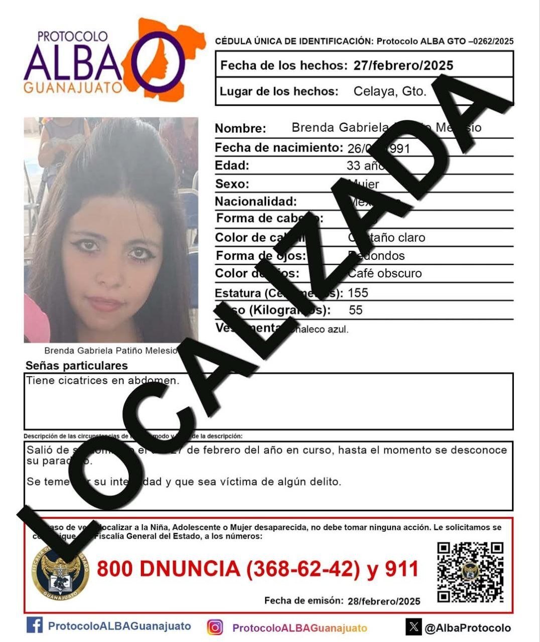 La joven había sido reportada como desaparecida el 27 de febrero en Celaya, lo que llevó a la activación de su ficha de búsqueda bajo el Protocolo Alba, un mecanismo diseñado para la localización inmediata de mujeres y niñas desaparecidas en México.