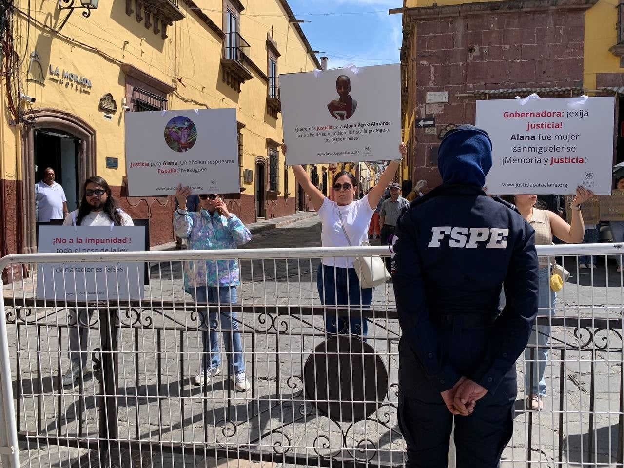 San Miguel de Allende, Guanajuato.- Distintos grupos de sanmiguelenses manifestaron su inconformidad por el cierre del jardín principal de San Miguel de Allende debido a la realización de una sesión solemne del Congreso del Estado. Ciudadanos y colectivos protestaron en las orillas del Centro Histórico para exigir más seguridad y cultura, la despenalización del aborto y justicia en el caso de Alana, menor asesinada hace un año por elementos de la Fiscalía del Estado durante un operativo.
