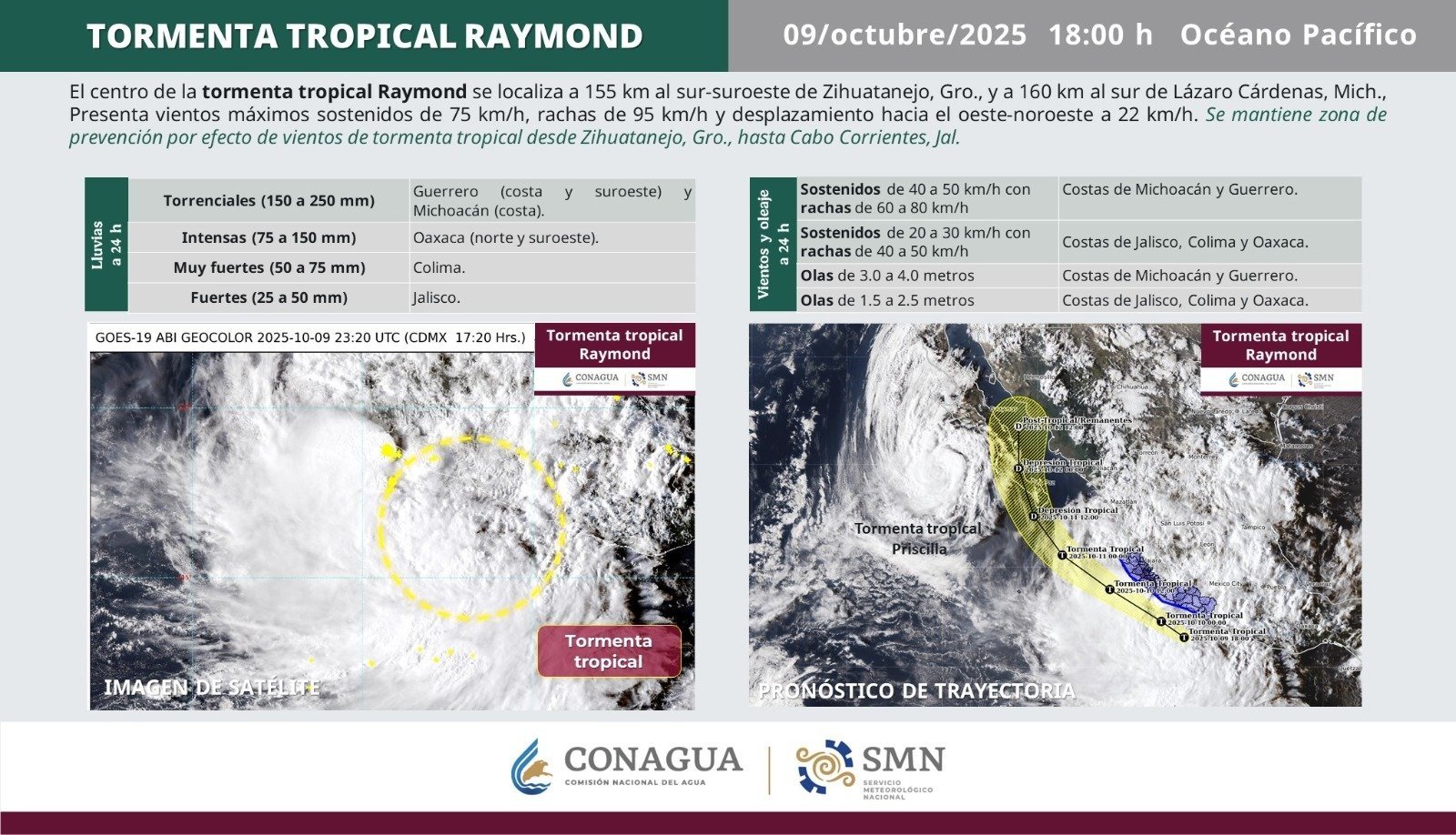 La Conagua advirtió que la combinación de la tormenta Raymond, la vaguada monzónica y los frentes fríos podría provocar acumulación de humedad y lluvias prolongadas, lo que aumenta el riesgo de inundaciones repentinas, crecidas de ríos y deslaves en zonas serranas y carreteras rurales.