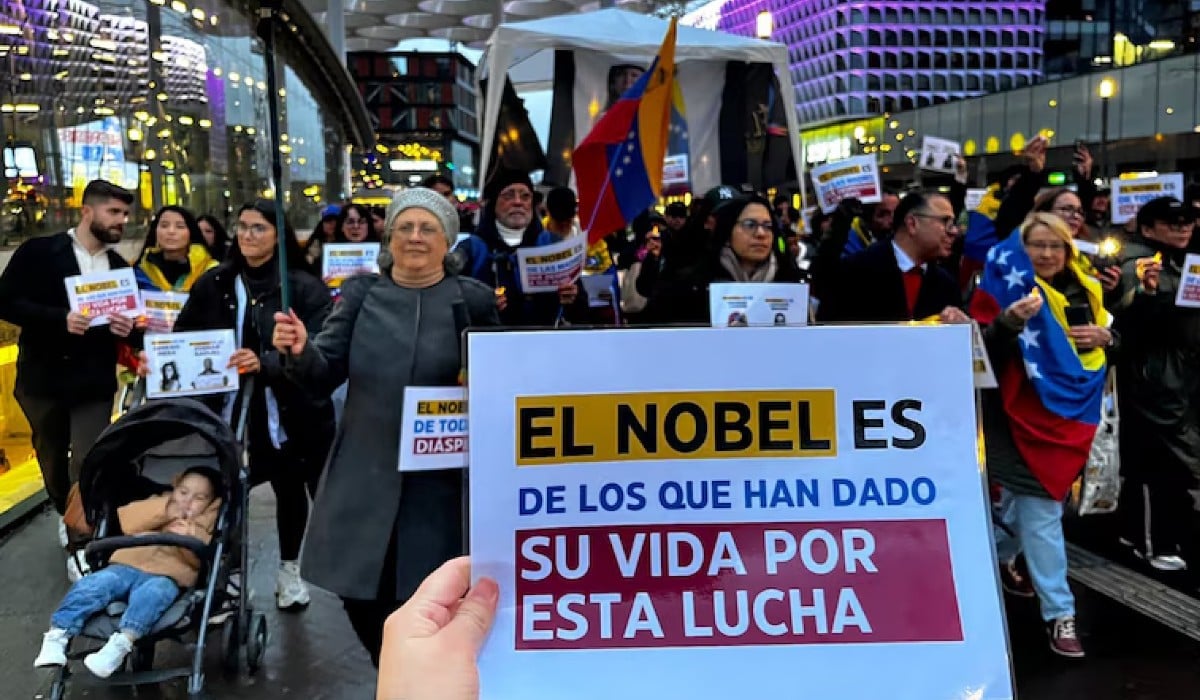 Contras las protestas contra Corina Machado, en varias ciudades del mundo, miles de migrantes venezolanos salieron a las calles y se tomaron fotos con mensajes de apoyo a la líder opositora y mensajes como “El Nobel es nuestro” para mostrar el reconocimiento mundial a Corina.