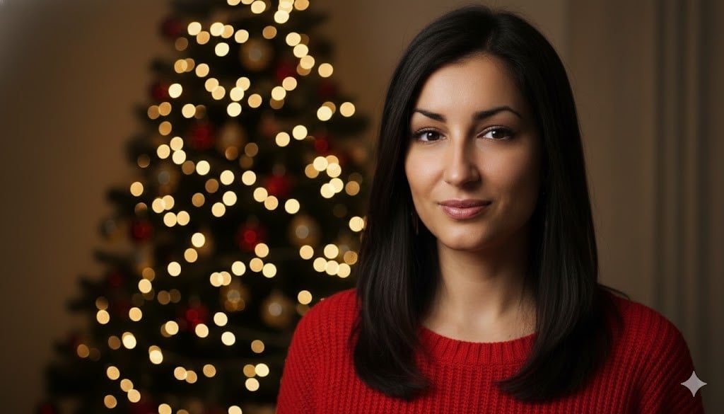 - Close-up cinematic portrait, serene and magical holiday mood. Using the reference image as a STRICT AND NON-NEGOTIABLE source, preserve the EXACT likeness, facial structure, body proportions, skin tone, and natural hair of the person. Do not alter facial structure or expression.