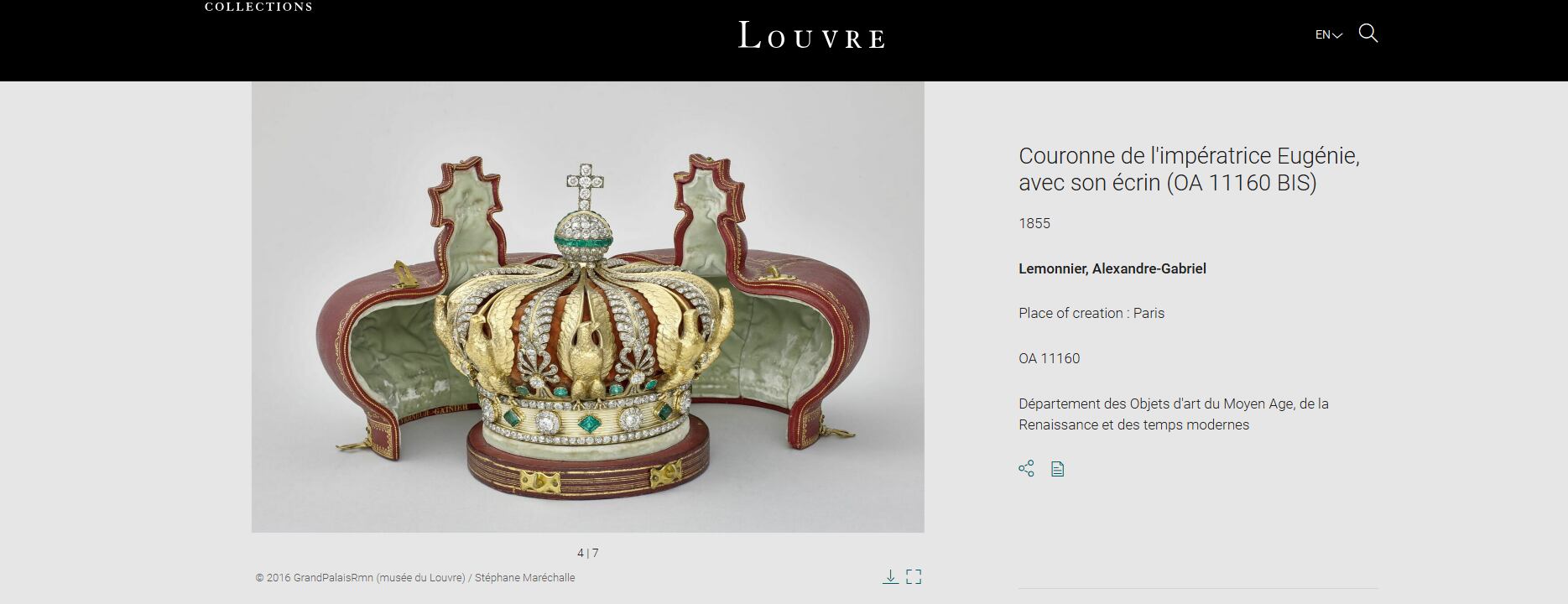 La corona de la emperatriz Eugenia tiene una historia tan brillante como accidentada. Tras la caída del Segundo Imperio en 1870, fue vendida por el Estado en 1885 como parte de la liquidación de los bienes monárquicos, y solo volvió al patrimonio nacional más de un siglo después gracias a una donación privada.