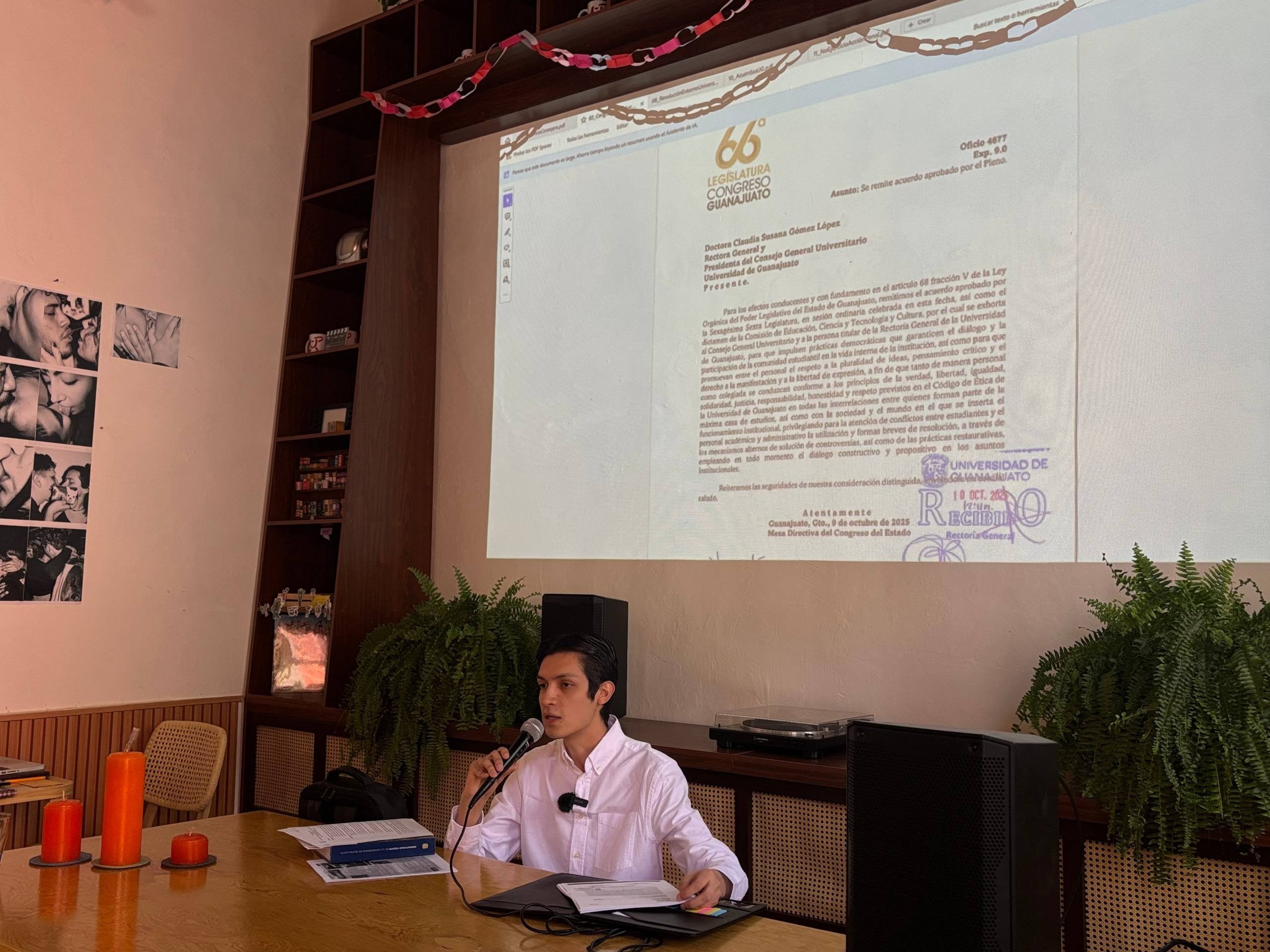 “En toda la intervención se me hicieron gestos, murmullos, incomodidad y se notaba que les molestaba; en mi intervención sentí falta de respeto por parte de la autoridad de nuestra institución. El grupo directivo de la UG es un atropello”, refirió.
