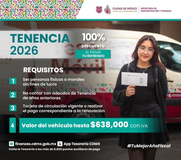 Por lo que se refiere a la tenencia, y para facilitar el cumplimiento tributario, la SAF informa que una vez cubierto el pago correspondiente al refrendo, que de acuerdo con el artículo 219 del Código Fiscal de la Ciudad de México para 2026 es de 760 pesos, se otorgará un descuento del 100 por ciento de la Tenencia vehicular en automóviles cuyo valor total, incluido el Impuesto al Valor Agregado, no exceda de 638 mil pesos, y para motocicletas cuyo valor total, incluido el Impuesto al Valor Agregado, no exceda los 250 mil pesos Dicho beneficio es para las personas físicas y morales sin fines de lucro.