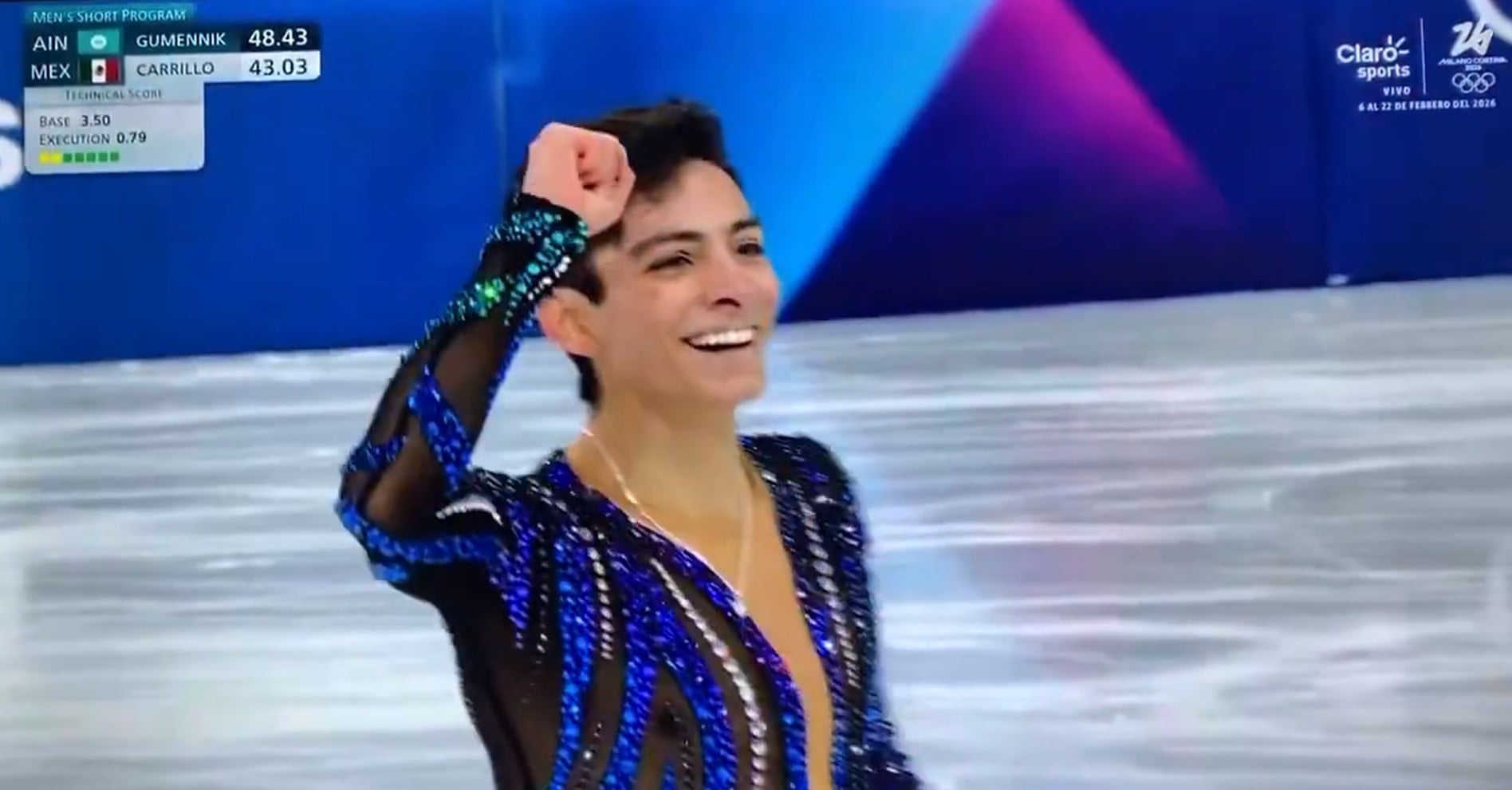 Durante su primera rutina en la que volvió a llevar el ritmo latino al hielo, alcanzó las 75.56 unidades, luego de la deducción de un punto por una leve caída durante un aterrizaje.