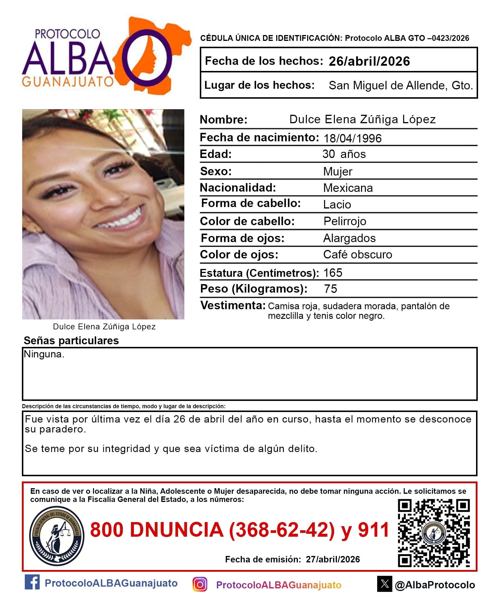 Dulce Elena Zúñiga López, de 30 años de edad, fue vista por última vez el 26 de abril de 2026 en San Miguel de Allende, Guanajuato, cuando usaba camisa roja, sudadera morada, pantalón de mezclilla y tenis color negro.