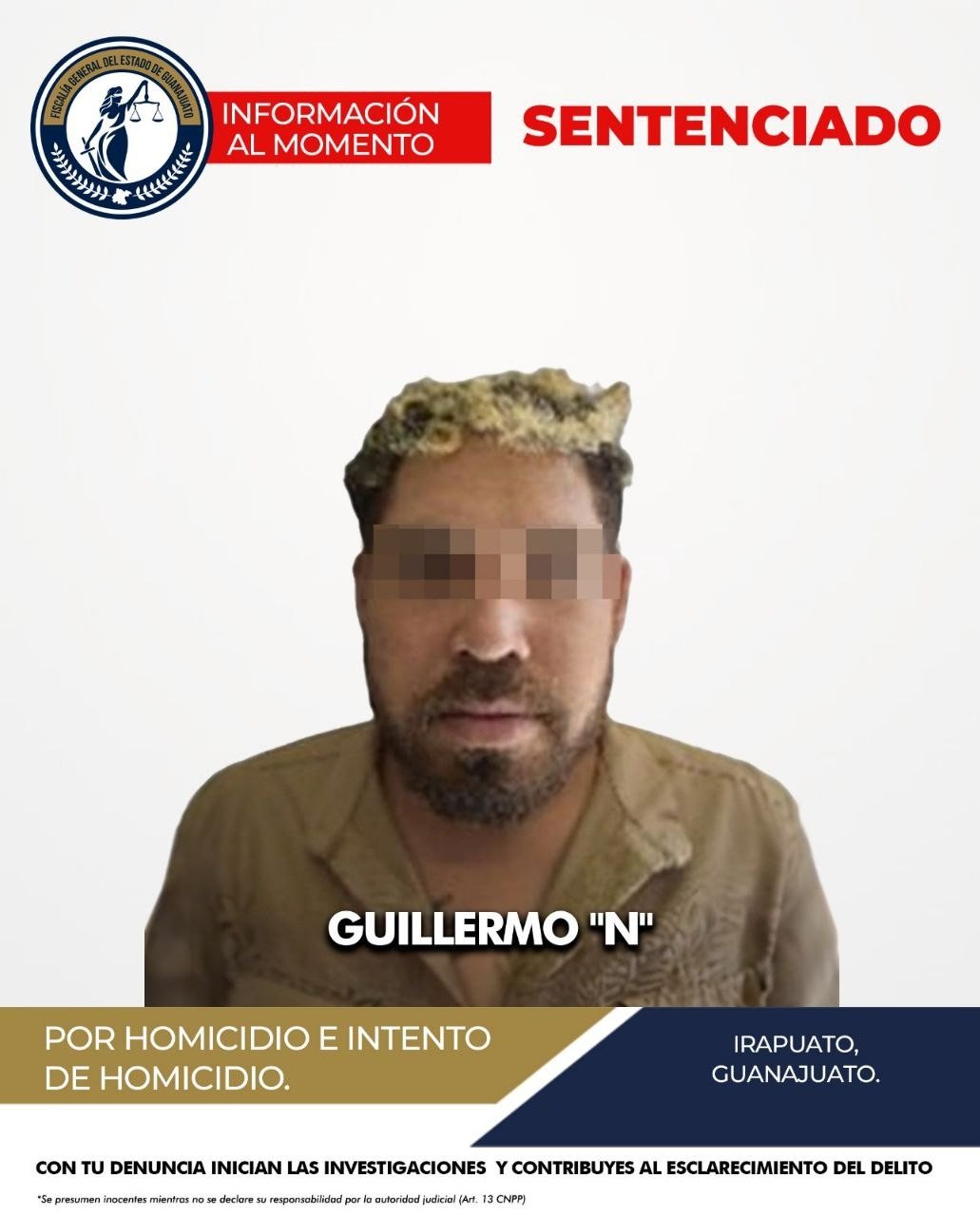 Irapuato, Gto.- La Fiscalía General del Estado (FGE) informó la sentencia dictada a Guillermo ‘N’ en Irapuato por los delitos de homicidio y tentativa de homicidio en un ataque efectuado en el ejido de Malvas.